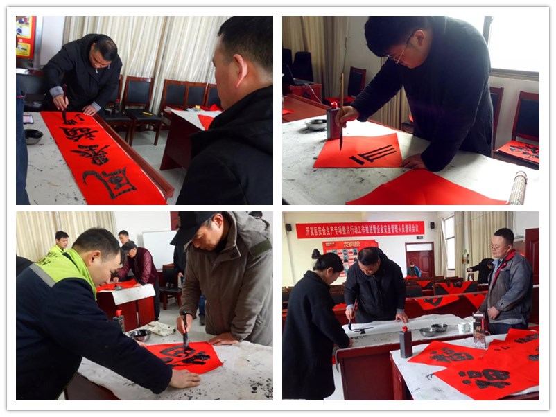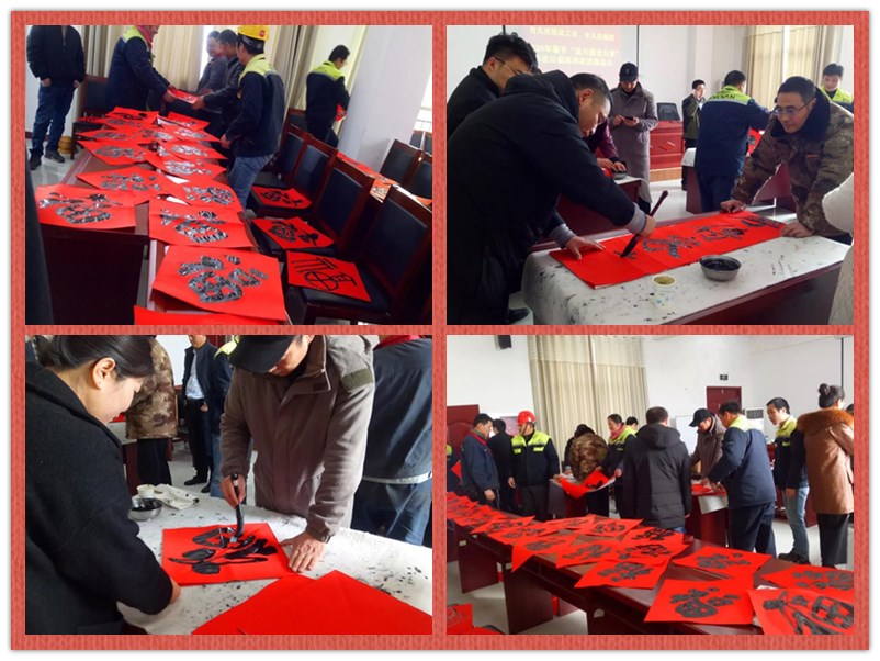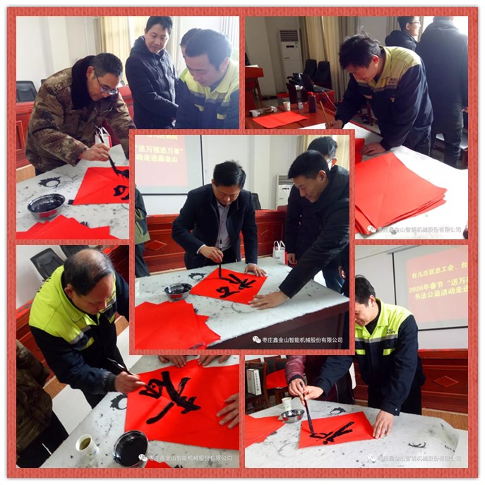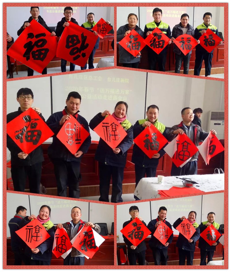 新春將至,為深入宣傳習近平新時(shí)代中國特色社會(huì )主義思想和黨的十九屆四中全會(huì )精神,弘揚中華優(yōu)秀傳統文化,增強職工的幸福感,營(yíng)造文明、健康、祥和的節日氛圍。1月10日上午,臺兒莊區總工會(huì )、臺兒莊畫(huà)院組織優(yōu)秀書(shū)法家走進(jìn)鑫金山,開(kāi)展2020年春節“送萬(wàn)福進(jìn)萬(wàn)家”書(shū)法公益活動(dòng),為鑫金山員工們現場(chǎng)書(shū)寫(xiě)“福”字和春聯(lián),送上了歡樂(lè )和春節祝福。