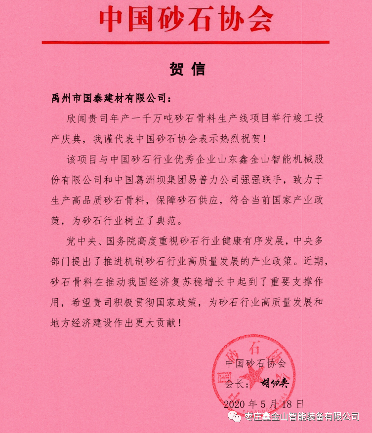 竣工儀式上,棗莊鑫金山智能裝備有限公司董事長(cháng)孫中巖以中國砂石協(xié)會(huì )副會(huì )長(cháng)單位名義宣讀中國砂石協(xié)會(huì )胡幼奕會(huì )長(cháng)賀信。首先,胡會(huì )長(cháng)在賀信中指出,對禹州市國泰建材有限公司年產(chǎn)一千萬(wàn)噸砂石骨料生產(chǎn)線(xiàn)項目竣工投產(chǎn)表示祝賀。并表示,該項目致力于生產(chǎn)高品質(zhì)砂石骨料,保障砂石供應,符合當前guojia產(chǎn)業(yè)政策,為砂石行業(yè)樹(shù)立了典范。
