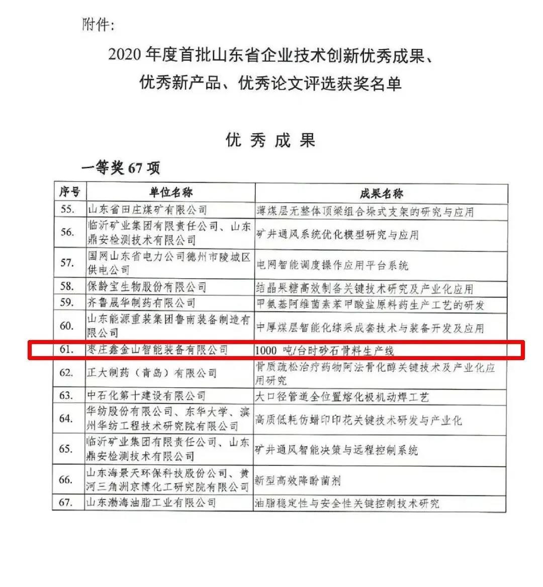 導讀:近日,從山東省企業(yè)技術(shù)創(chuàng )新促進(jìn)會(huì )傳來(lái)喜訊,正式公布2020年首批山東省企業(yè)技術(shù)創(chuàng )新優(yōu)秀成果、優(yōu)秀新產(chǎn)品、優(yōu)秀論文評選結果名單,棗莊鑫金山智能裝備有限公司研發(fā)打造的“1000噸/臺時(shí)砂石骨料生產(chǎn)線(xiàn)”,成功獲評優(yōu)秀成果一等獎。