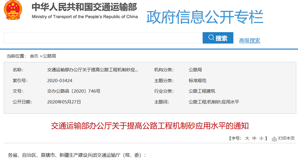 導讀:日前,交通運輸部辦公廳印發(fā)《關(guān)于提高公路工程機制砂應用水平的通知》。