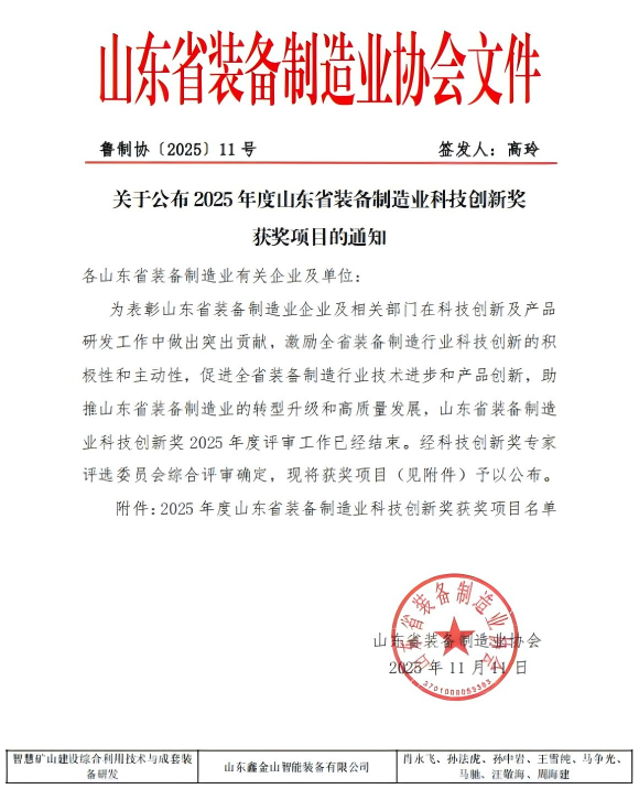近日,山東省裝備制造業領域傳來重磅捷報 —— 由山東鑫金山智能裝備有限公司自主研發的 “智慧礦山建設綜合利用技術與成套裝備研發” 項目,在 2025 年度山東省裝備制造業科技創新獎評選中脫穎而出,榮膺一等獎!這一省級權威榮譽,是對鑫金山科技創新實力的高度認可。