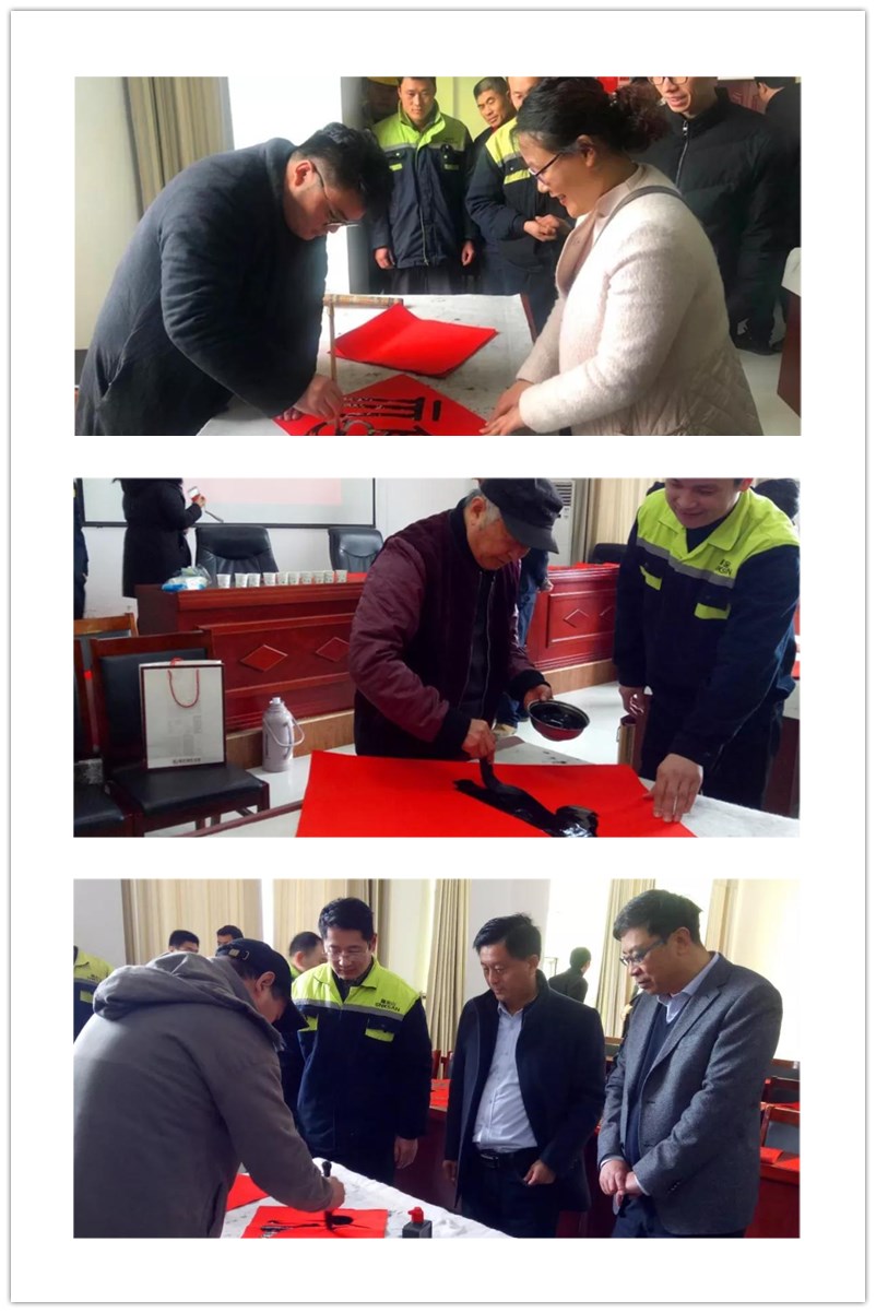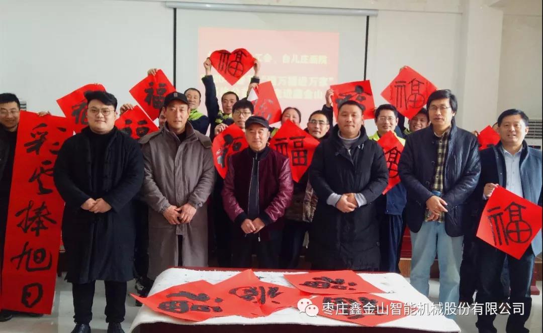 新春將至,為深入宣傳習近平新時(shí)代中國特色社會(huì )主義思想和黨的十九屆四中全會(huì )精神,弘揚中華優(yōu)秀傳統文化,增強職工的幸福感,營(yíng)造文明、健康、祥和的節日氛圍。1月10日上午,臺兒莊區總工會(huì )、臺兒莊畫(huà)院組織優(yōu)秀書(shū)法家走進(jìn)鑫金山,開(kāi)展2020年春節“送萬(wàn)福進(jìn)萬(wàn)家”書(shū)法公益活動(dòng),為鑫金山員工們現場(chǎng)書(shū)寫(xiě)“福”字和春聯(lián),送上了歡樂(lè )和春節祝福。