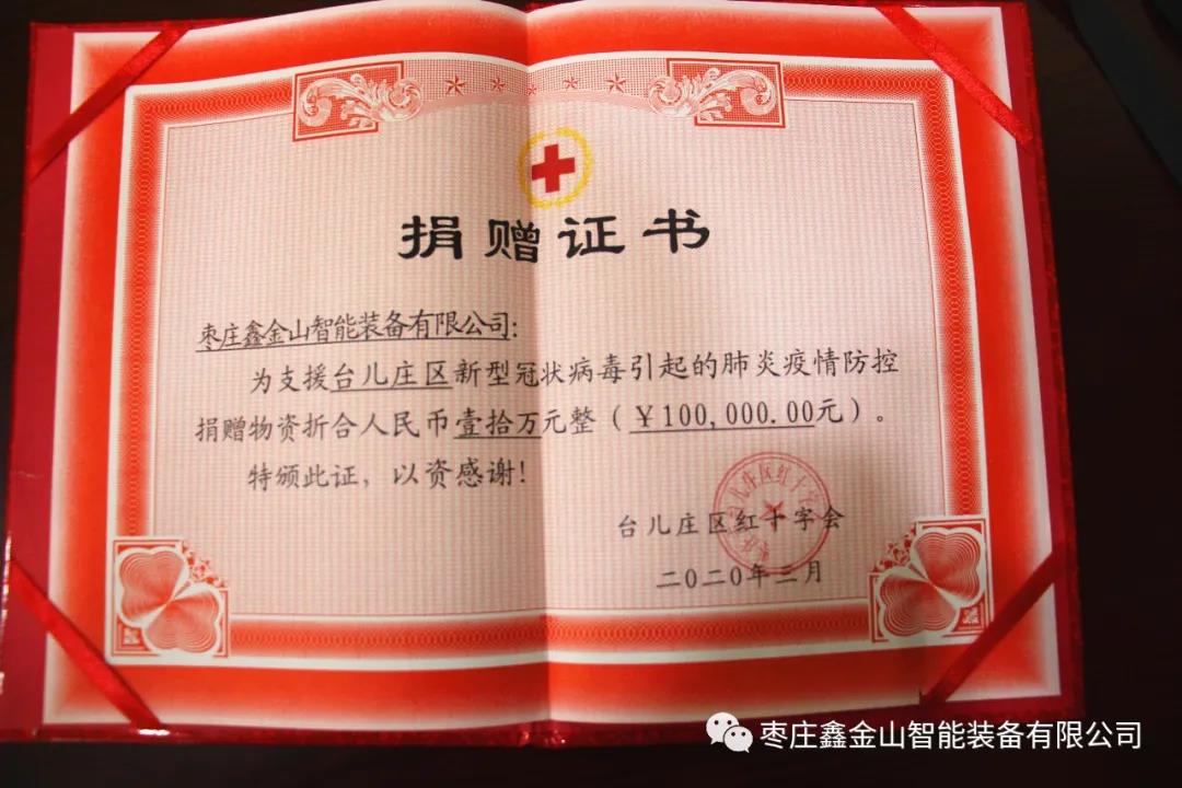 導讀:3月28日上午,棗莊鑫金山智能裝備有限公司向棗莊市臺兒莊區紅十字會(huì )捐贈價(jià)值10萬(wàn)元的防疫物資,用于新型冠狀病毒肺炎疫情的防控工作,以實(shí)際行動(dòng)踐行企業(yè)的責任和擔當,為抗擊疫情貢獻一份力量。