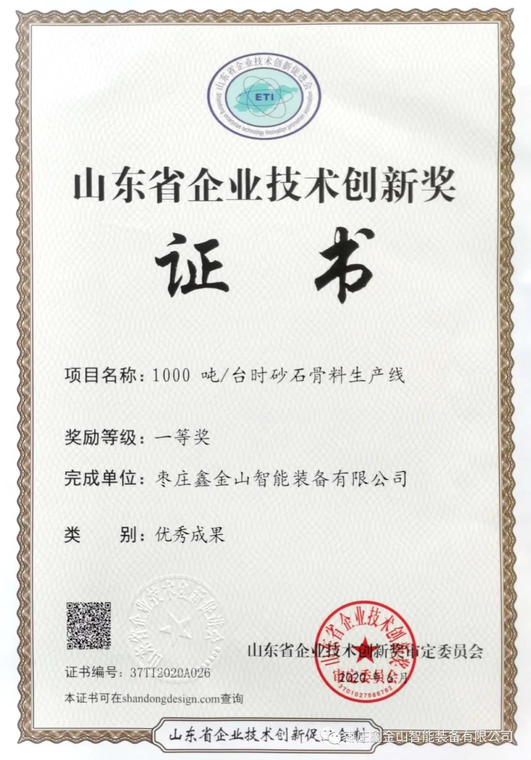導讀:近日,從山東省企業(yè)技術(shù)創(chuàng )新促進(jìn)會(huì )傳來(lái)喜訊,正式公布2020年首批山東省企業(yè)技術(shù)創(chuàng )新優(yōu)秀成果、優(yōu)秀新產(chǎn)品、優(yōu)秀論文評選結果名單,棗莊鑫金山智能裝備有限公司研發(fā)打造的“1000噸/臺時(shí)砂石骨料生產(chǎn)線(xiàn)”,成功獲評優(yōu)秀成果一等獎。