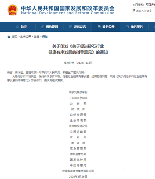 導讀:為穩定砂石市場(chǎng)供應、保持價(jià)格總體平穩、促進(jìn)行業(yè)健康有序發(fā)展,經(jīng)國務(wù)院同意,2020年3月25日,國家發(fā)改委等十五部門(mén)和單位聯(lián)合印發(fā)了《關(guān)于促進(jìn)砂石行業(yè)健康有序發(fā)展的指導意見(jiàn)》。