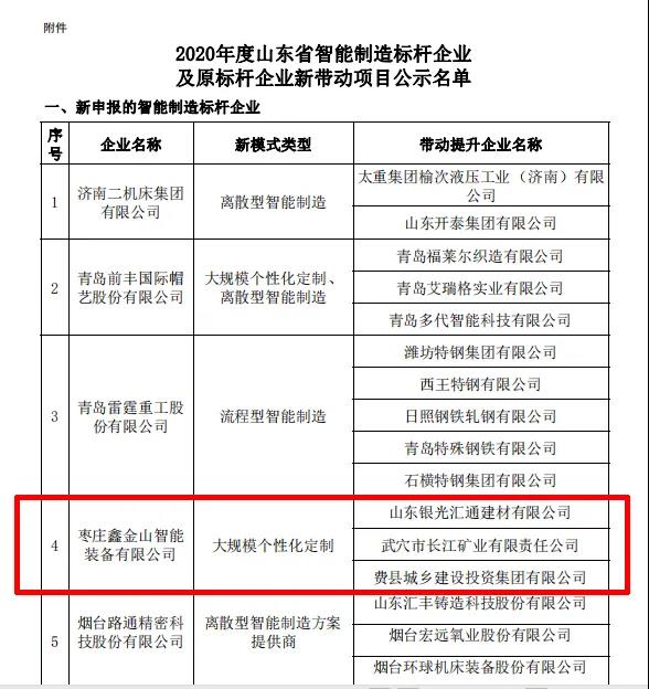 近日,省工業和信息化廳對獲評2020年度山東省智能制造標桿企業及原標桿企業新帶動項目名單進行了公示,棗莊鑫金山智能裝備有限公司成功入選,成為了2020年度山東省首批智能制造標桿企業之一。
