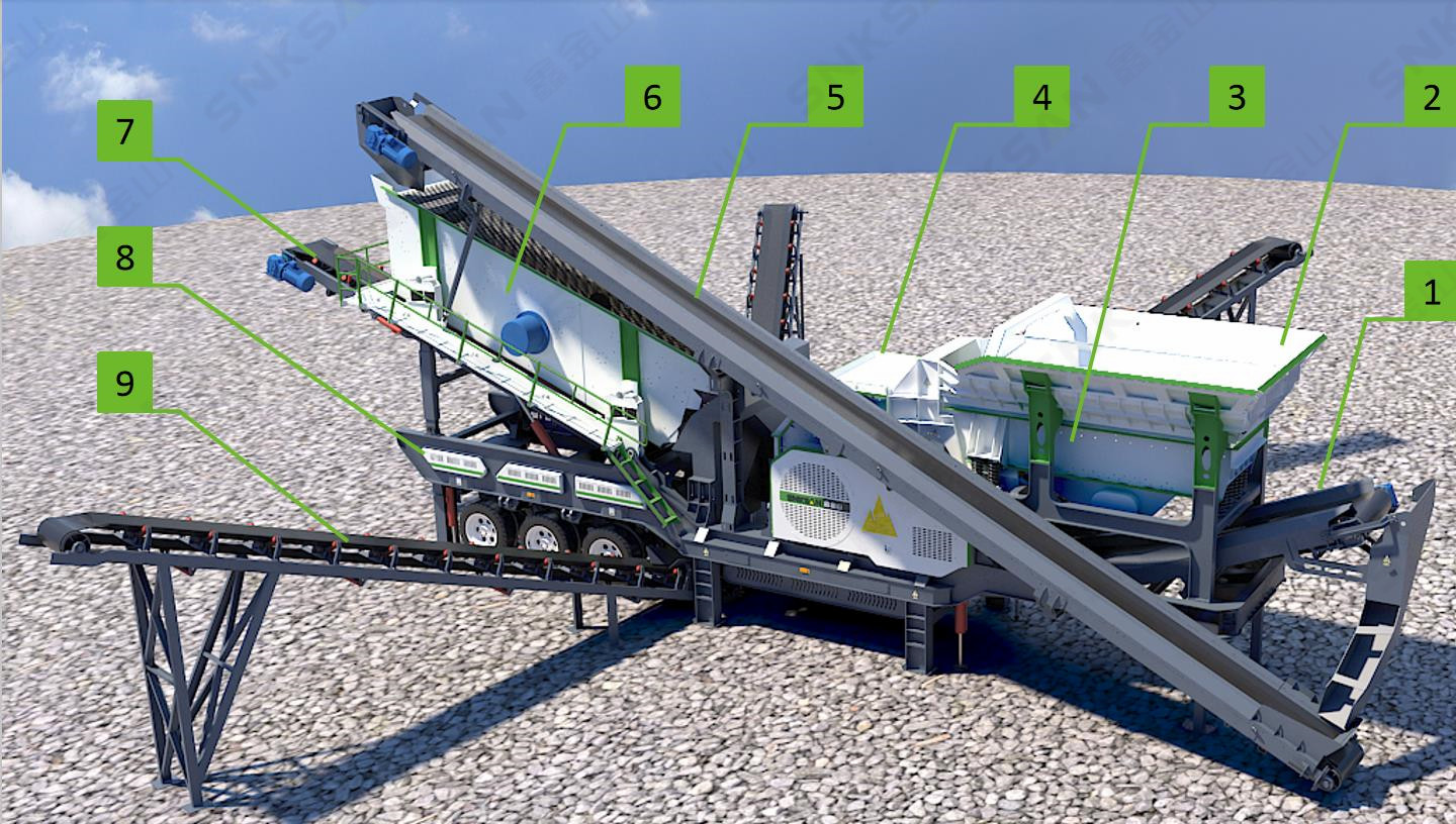 1、主皮帶機 2、料倉 3、給料機 4、錘破 5、上料皮帶機 6、振動(dòng)篩 7、篩下皮帶機 8、車(chē)架 9、外掛皮帶機